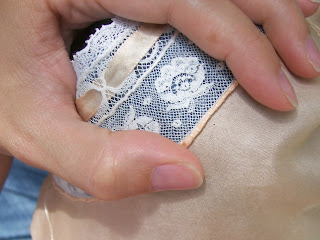 Trim the seam to 1/4 inch, no more, and press it back away from the neckline. Be very careful when trimming and don’t snip your lace!